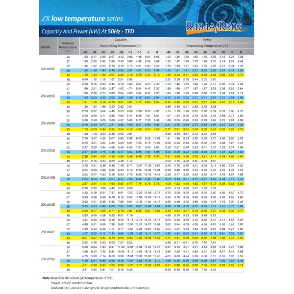 ZX LT CDU applies vapor injection technology. This allows an economizer cycle on scroll compressors. Vapor injection significanly improves the LT operational efficiency and extends the LT envelope.
